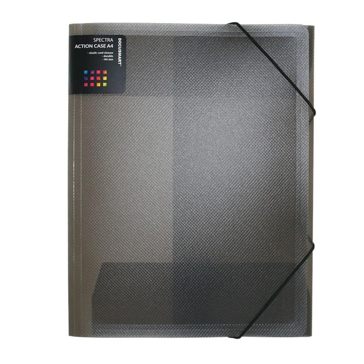 Docusmart Spectra är en produktserie med färgstarka mappar tillverkade i extra tjock och slitstark PP-plast, med en unik ytstruktur. Docusmart Spectra gummisnoddsmapp i A4-format har tre klaffar och är gjord av hållbar 0,7 mm PP-plast. Mappen är halvtrans