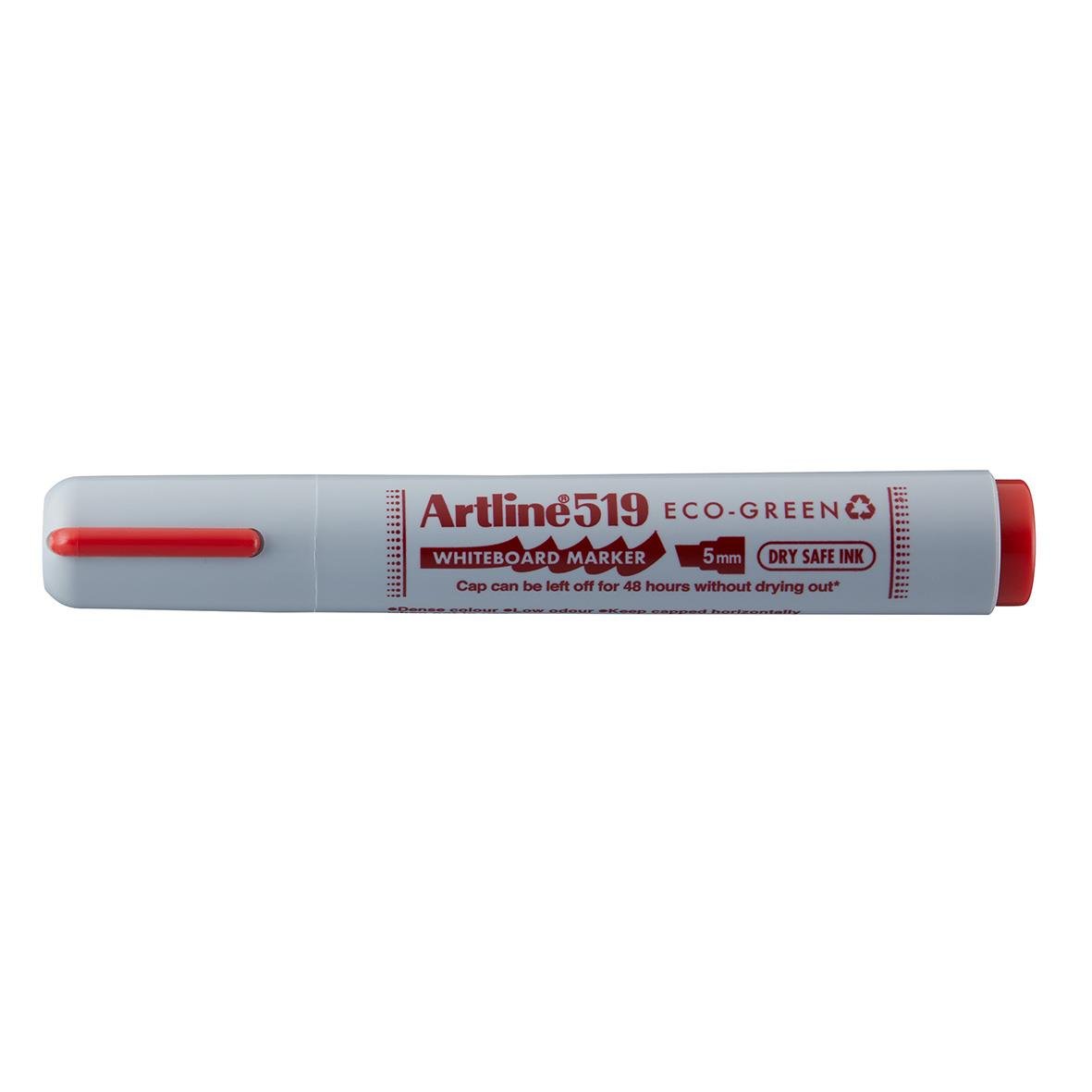 Whiteboardpenna Artline 519 ECO-GREEN Sneddskuren Röd. Whiteboard-penna med skuren spets och 2-5 mm skrivbredd. Plasthylsa i återvunnen plast, alkoholbaserat pigmenttusch utan Xylen, Dry Safe-funktion vilket betyder att den vara utan huv i 48 timmar.Tillv