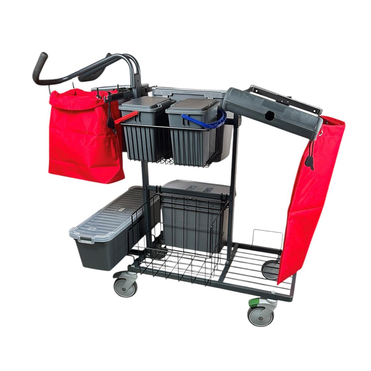 Städvagn Alloffice Maxi Gen2. Det här är en stor städvagn för professionell städning som har utrustats med anpassade funktioner för städning med impregnerat material på stora objekt. Vagnen har generöst med utrymme för påfyllningsmaterial, moppar och duk
