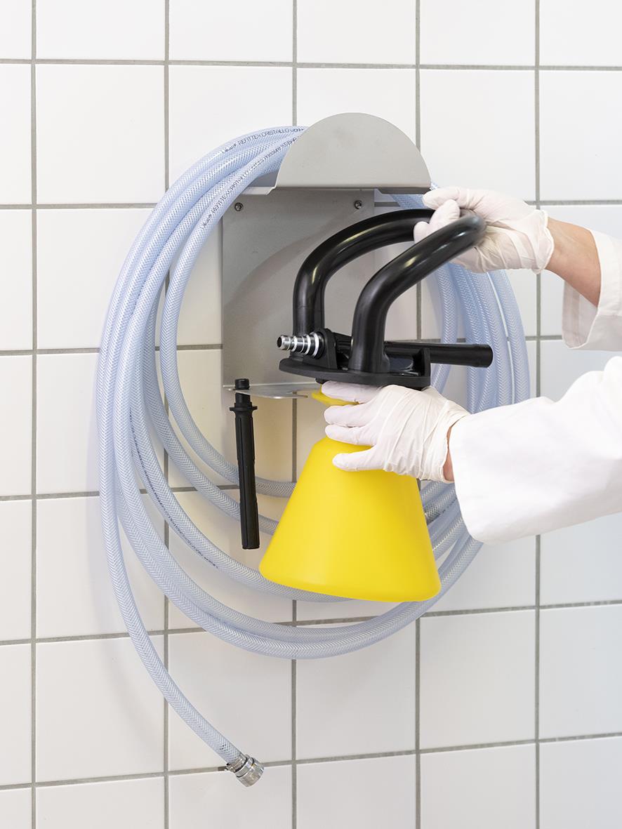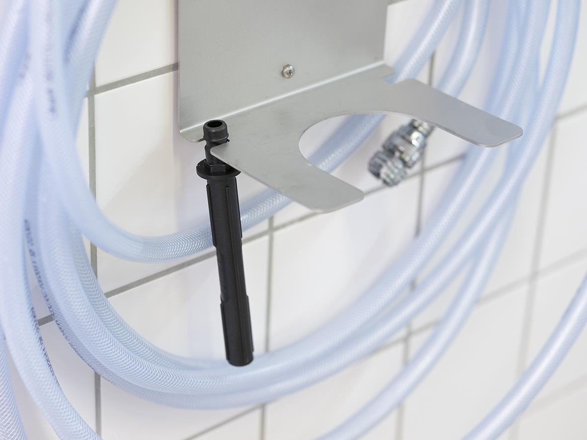 Upphäng för slang och skumspruta för montering på vägg. Maximalt 20 m slang.