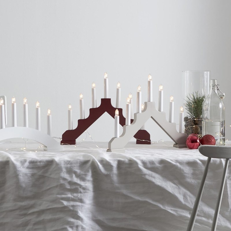 Röd klassisk träljusstake med 7 ljuskällor. Skapar en mysig adventskänsla i med härligt sken. 1,8 m sladd.