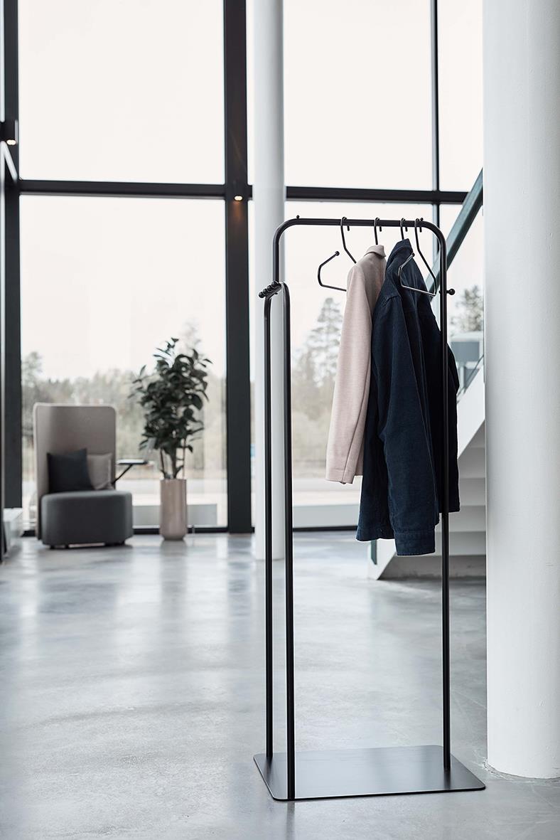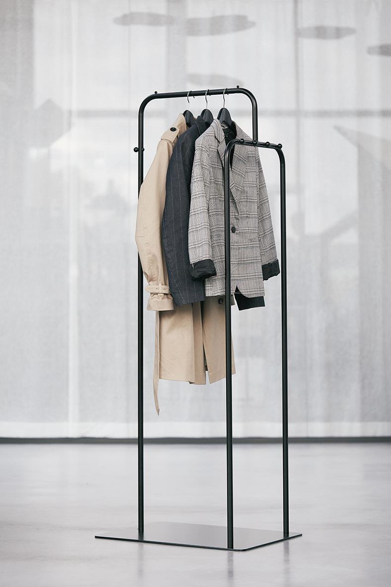 Snygg och stilren klädhängare med knoppar och plats för galgar. B: 450 H:1600 D: 600 Färg: Svart Tillval: Påbyggnadsrör, för att kunna bygga ihop fler.