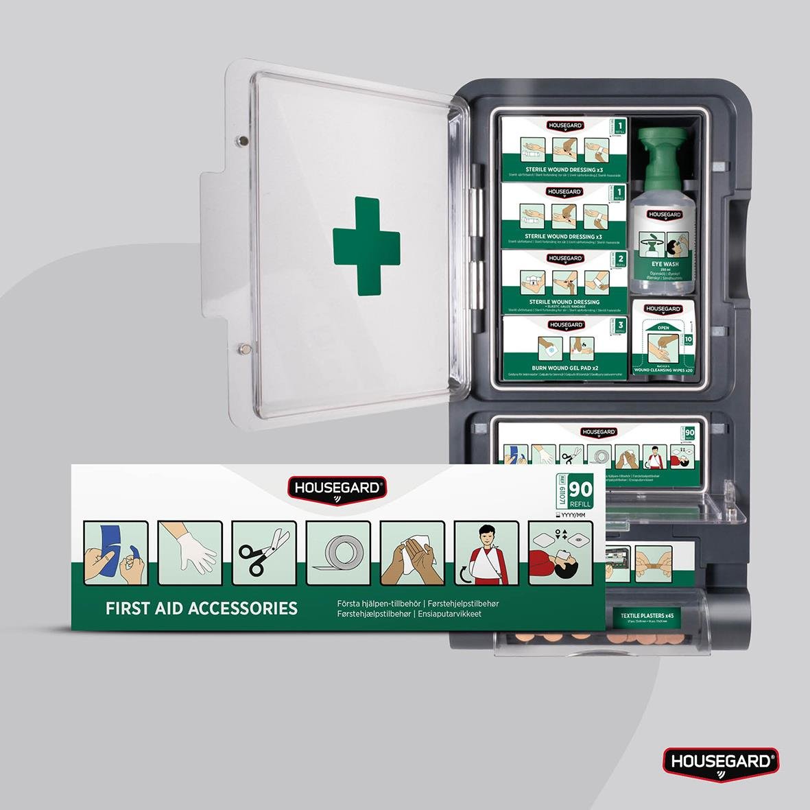 Tillbehörsboxen är framtagen som refill till första hjälpen-stationer och innehåller sax, självhäftande tejp, mitella, rengöringsservett, självhäftande fingerförband, mun-mot-mun-skydd och engångshandskar. Boxen gör det enkelt att hålla första hjälpen-st