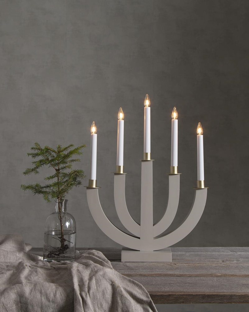Träljusstake med 5 ljuskällor och guldmålad dekor. Lätt att placera och skapar en härlig julstämning både i fönster och inne i rummet på t ex en hylla eller skänk. Sladd 1,8 m. Mått B x H x D: 37 x 47 x 8 cm. Beige.