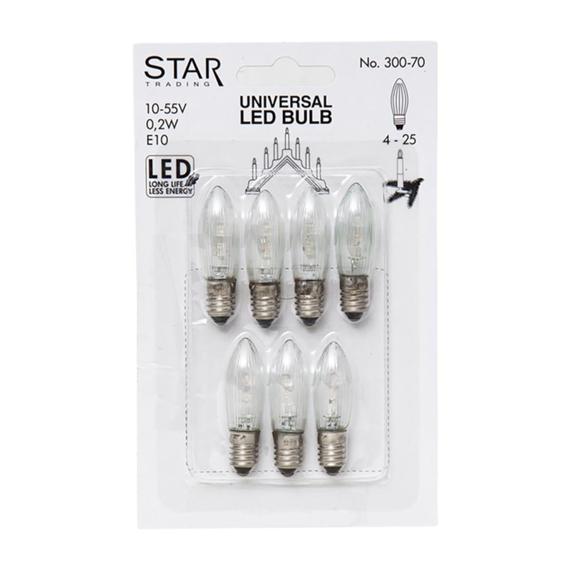 Reservlampa Universal LED 0,2W Varmvit Klar. 7-pack reservlampor Universal LED. Lamporna har klart glas och E10 sockel, 10-55V. Denna produkt passar till ljusstakar med 4-25 lampor och stickkontakt. För inomhusbruk.