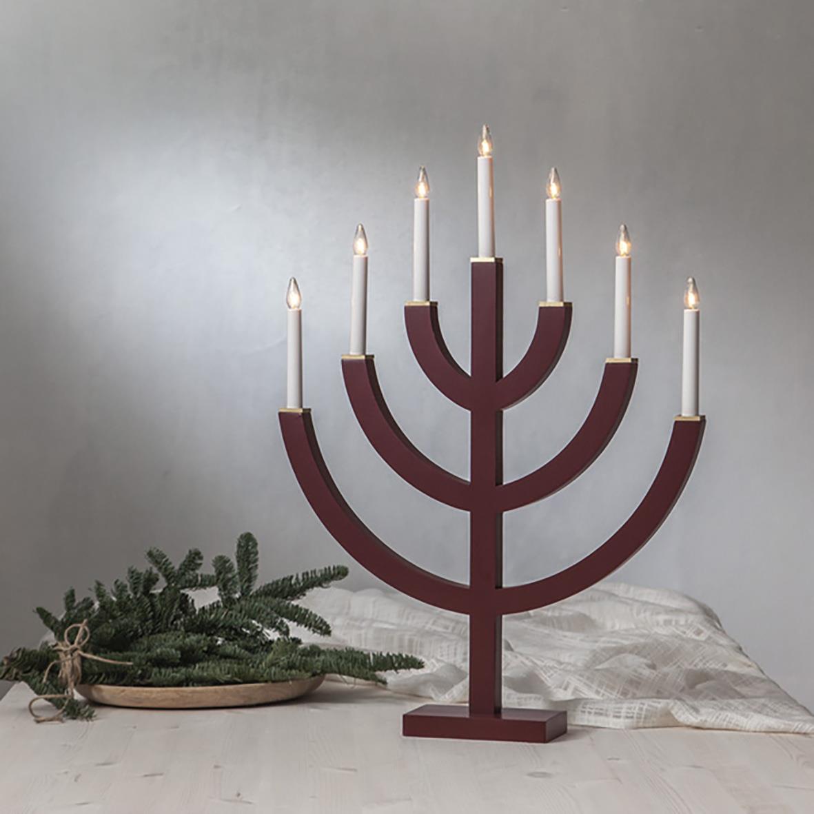 Stämningsfull röd adventsljusstake tillverkad i trä med målade träbrickor i guld som dekoration. Ljusstaken är både modern och traditionell och passar utmärkt i ett fönster eller på en skänk. Julen blir något alldeles extra med stämningsfulla Anno som dek