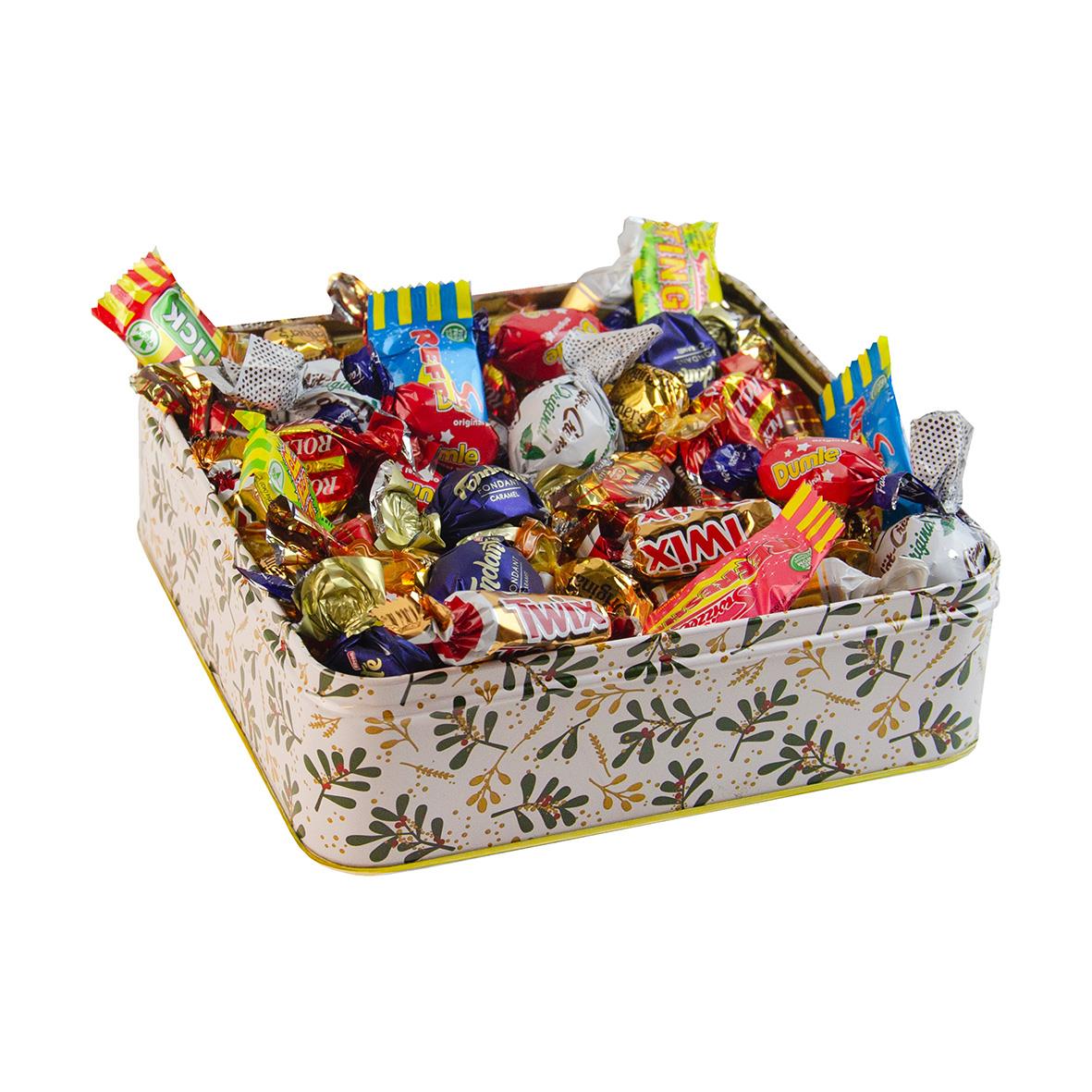 Julig dekorativ plåtlåda med ett fönster som visar det goda innehållet. När det goda tar slut finns där en trevlig julhälsning i botten. Innehåller: Dumle, Twix, Werthers original creamy toffee, Werthers original toffee, Choko original toffee, Refreshers,