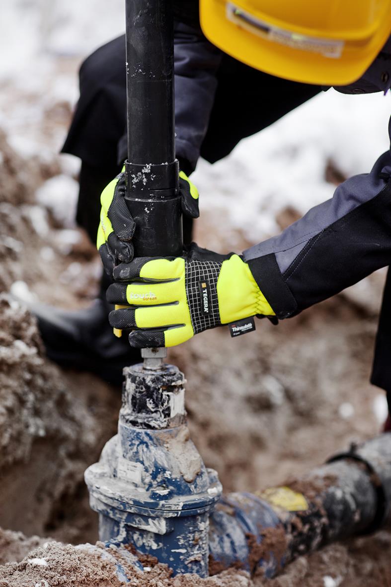 Läderhandske Tegera 9128 9. Ergonomisk, vattentät handske i Microthan+® med touchscreen-funktion. Thinsulate™ och invändig fleece håller kvar kroppsvärmen. Slitstarkt Microthan®+ syntetläder. Bra grepp på hala ytor tack vare diamant greppmönster. Ovanh