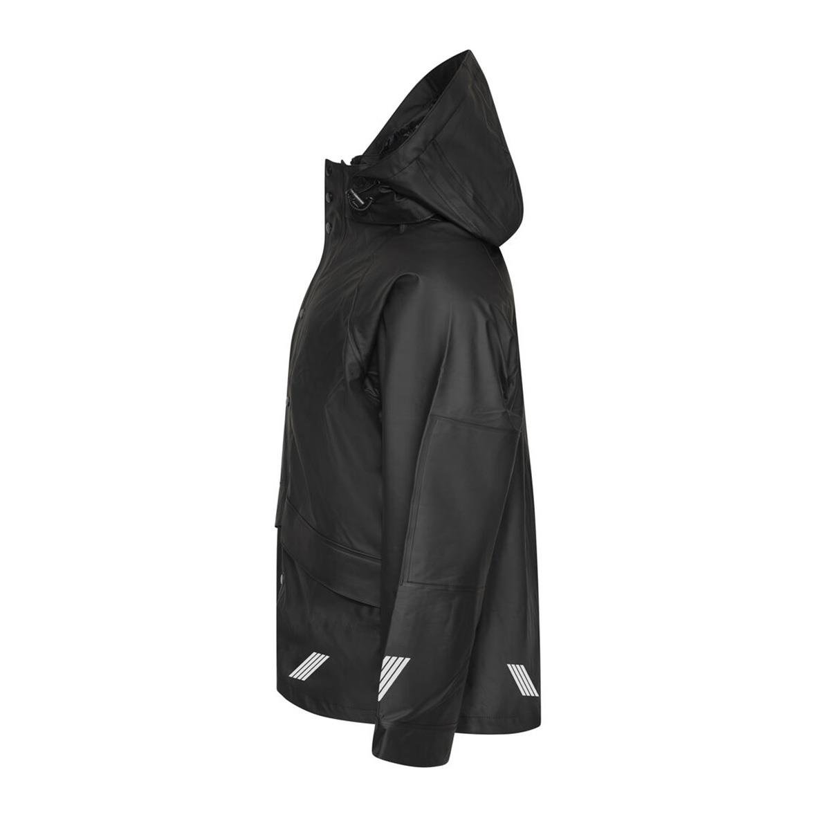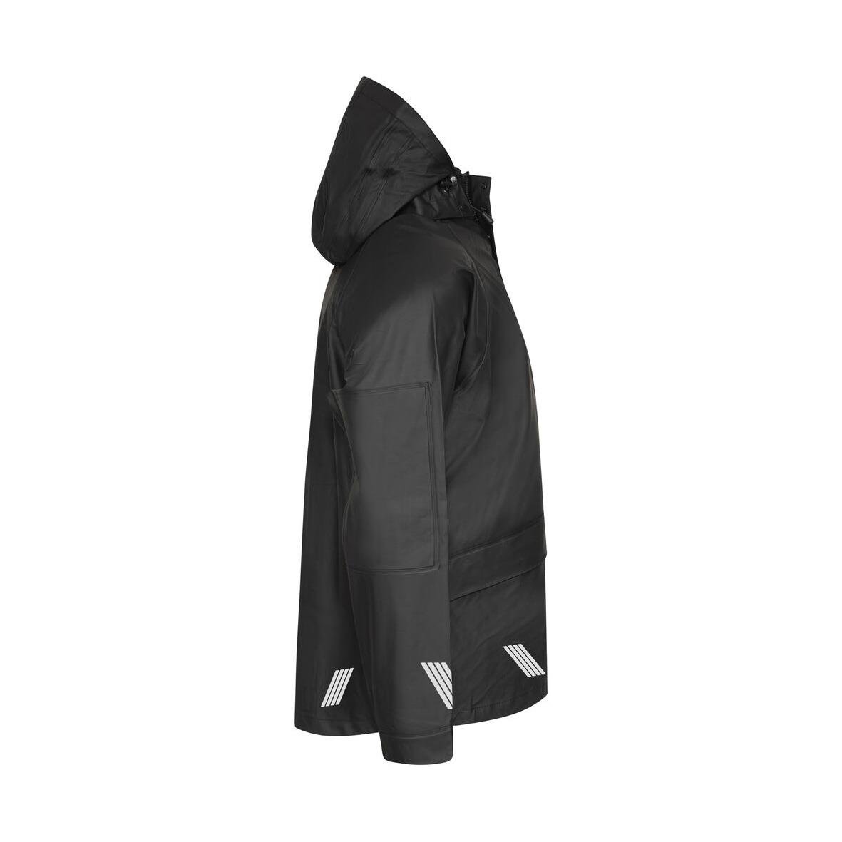 Regnjacka Projob 4430 Svart S Regnjacka med tryckknappar samt dragkedja framtill. Sydda och svetsade sömmar. Reglerbara ärmslut med tryckknappar. Reglerbar huva. Re?exdetalj i nederkant av jackan på fram- och baksida, även på ärmarna. Material - 58% PVC