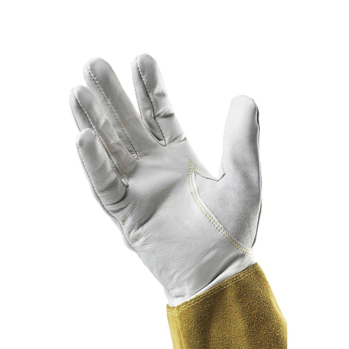 Läderhandske Tegera 126A 11. Högkvalitativ läderhandske med utmärkt komfort, flexibilitet och sömmar i Kevlar®. Handsken är industristandard för TIG-svetsning. Lång manschett ger extra skydd mot stänk. Elastisk handled för bättre passform, ofodrad för ex