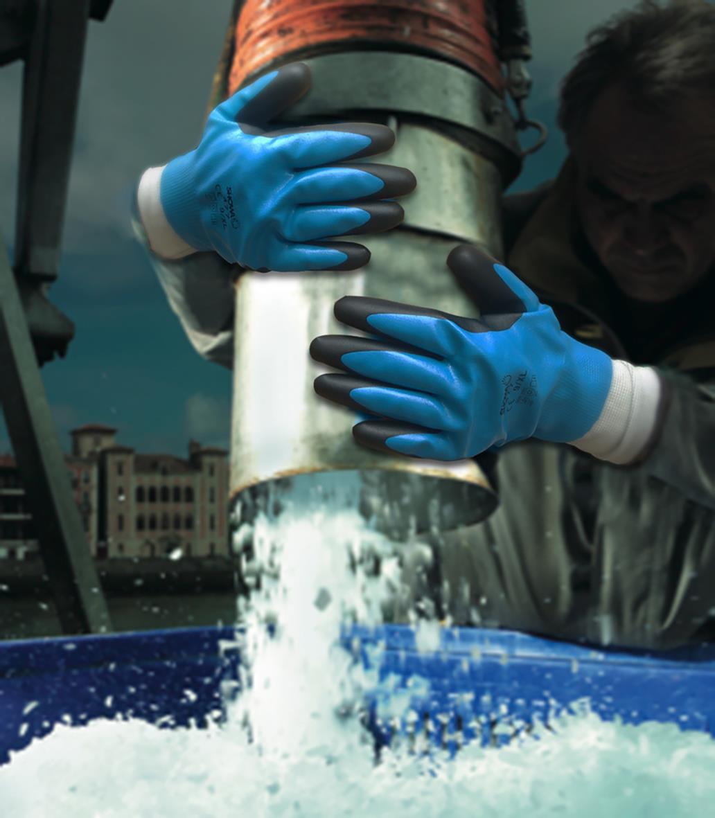 Handske Showa 477 Nitril Winter Svart/Blå 10. För användare som önskar hålla sina händer torra och varma i kall och blöt omgivning är Showa 477 det självklara valet. En bra kombination av varmt akrylfoder och ett yttermaterial som är tätt mot både vatte