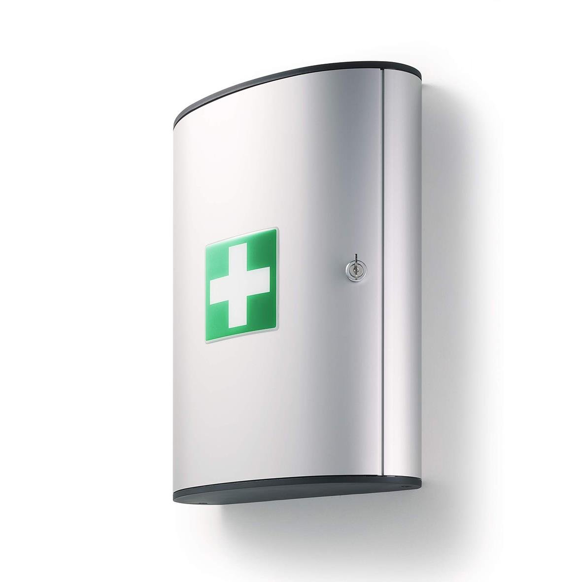 Samla förbandsartiklar, huvudvärkstabletter och liknande på ett och samma ställe, så att det är lätt åtkomligt när det behövs. Designat första hjälpen skåp av aluminium med 3 svängbara fack som kan fyllas med innehåll efter behov. Skruv och plugg för vägg