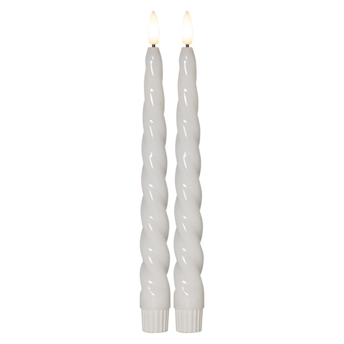 Vita antikljus 2-pack i Flamme Stripe serien, gjorda i vax i med en räfflad-randig yta. Ljusen har en mycket naturtrogen låga som lyser med varmvitt sken. De har timerfunktion vilket gör att ljusen lyser i 6h per dag i ca 30 dagar. De drivs av 2 st AAA ba